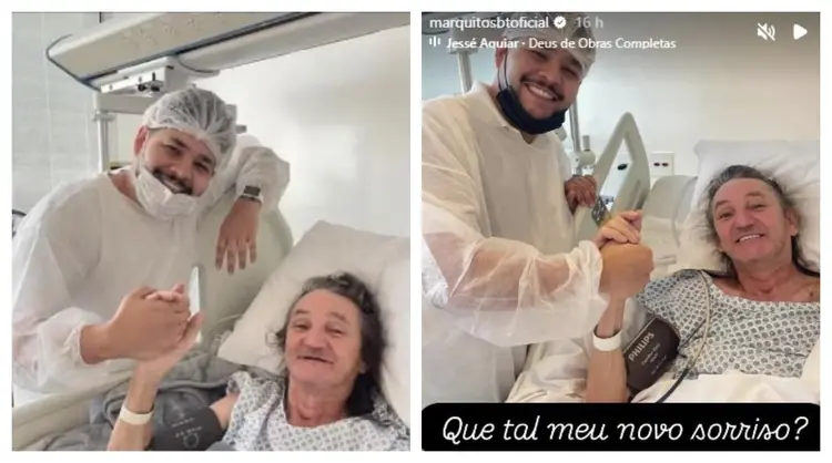 Há cerca de uma semana, Marquito apareceu banguela ao lado de seu dentista no hospital onde está internado após grave acidente de moto. Depois surgiu com prótese dentária, no último dia 26 de abril Reprodução/Montagem/Redes sociais Após dois meses de internação em São Paulo por causa de um grav